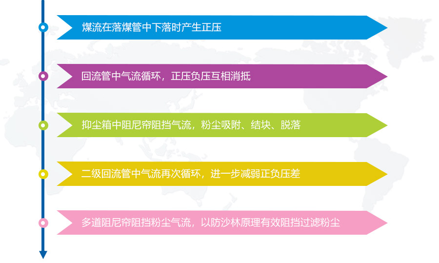 無動力抑塵裝置是根據(jù)空氣動力學,能量守恒等原理,采用壓力平衡和密閉循環(huán)方式,降低了導料槽內氣流的壓力,多路吸塵、降塵,最終使得粉塵能量衰竭落回輸煤皮帶,避免了粉塵外溢,有效保護了環(huán)境,而且大幅度節(jié)約安裝空間,無能源消耗,低維護費用,無二次污染。加裝無動力抑塵裝置后導料槽出口的揚塵濃度低于國家標準4mg/m³。